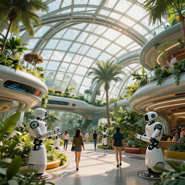 Photograph of a futuristic, sunlit atrium with a glass dome ceiling. Two white humanoid robots with black accents stand on either side, interacting with visitors. Lush green plants and tall palm trees fill the space. Curved, metallic balconies with potted plants are on the right and left. People, including a woman in a green top and black shorts and another in a blue dress, walk through the center. The floor is light-colored stone, and sunlight streams through the glass ceiling, creating a bright and airy atmosphere.