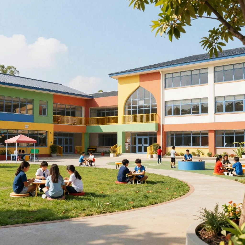 A vibrant and modern elementary school campus featuring colorful buildings with green, yellow, orange, and white facades. The outdoor area includes grass patches and paved walkways, designed to promote learning and recreation under bright natural sunlight. Children are seated on cushions around low tables, engaged in groups, highlighting an inviting learning environment with contemporary architectural elements and playful colors.