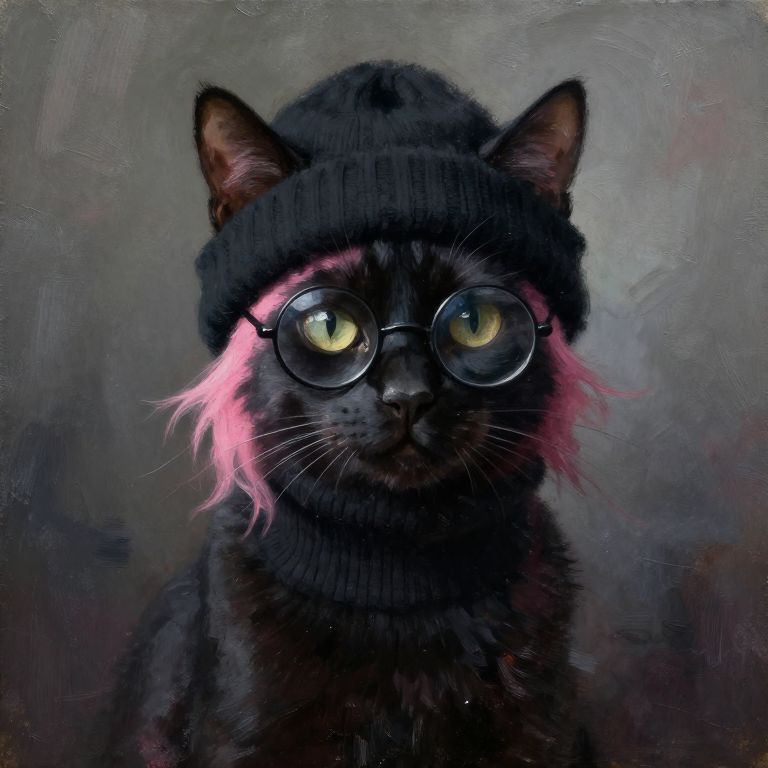 Digital painting of a black cat with striking yellow eyes, wearing round glasses and a black beanie. The cat has pink hair streaks on its cheeks, adding a pop of color. The background is a textured, dark gray, abstract pattern, which contrasts with the cat's vivid features. The cat's fur is depicted with fine, realistic detail, while the beanie and glasses add a whimsical, human-like touch. The overall style blends realism with a touch of surrealism, creating a unique and captivating portrait.
