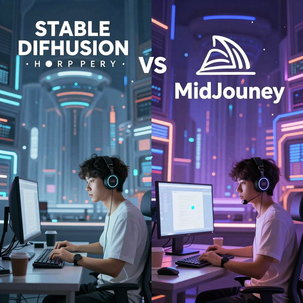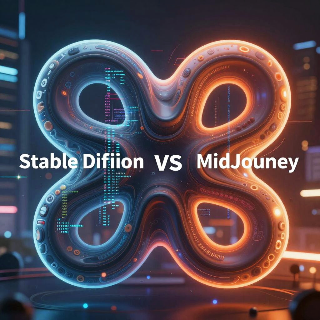 Digital art of glowing, neon blue and orange knot-shaped object with "stable Diffusion VS MidJourney" text, urban cityscape background.