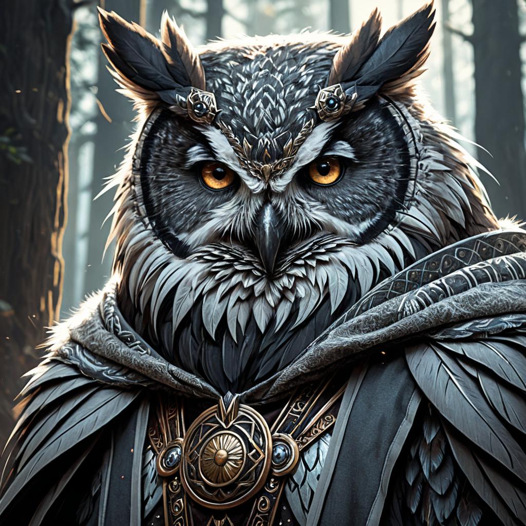 Close-up digital painting of a humanoid grey owlbear with intricate feather details and amber eyes. The owlbear wears an ornate, loose tunic with elaborate metallic decorations and a fur-lined cloak. The character has a serious expression and is set against a blurred forest background, showcasing detailed fantasy artwork inspired by concept art styles.