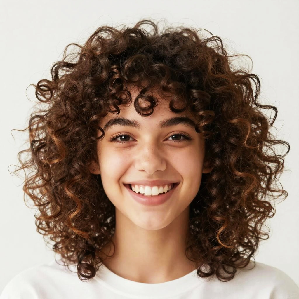 What would I look like with curly hair concept, digital art portrait, vibrant curls cascading around a smiling face, playful and lively atmosphere, warm tones, high detail in hair strands and natural skin texture, contemporary style