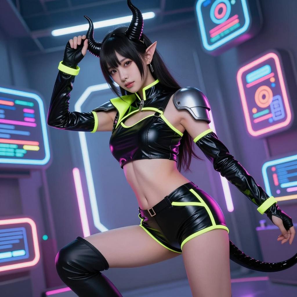 Asian woman in cosplay photograph. Black hair, blue eyes, black leather outfit, transparent plastic cape, black thigh-high boots. Bending forward, right hand touching face, left hand touching cape. Background: urban setting with blurred buildings, street. Textured surface underfoot. Intense expression. Black gloves. Upper body leaning forward, legs slightly apart. Two-tone eye makeup. Black headband with small horn-like shape. Black leather straps on outfit. Black and white color contrast. Urban cityscape background.