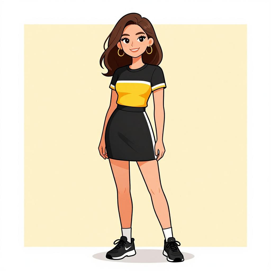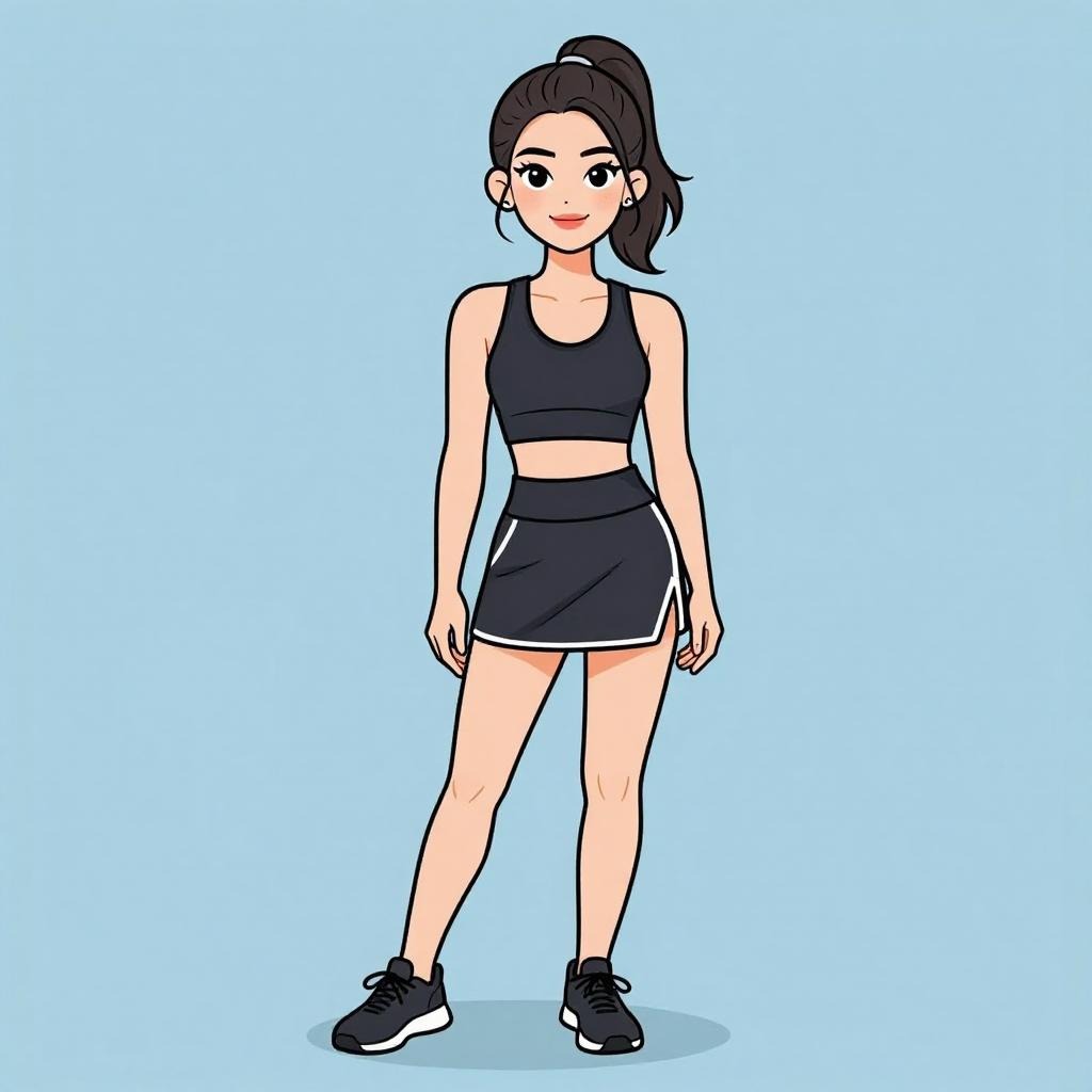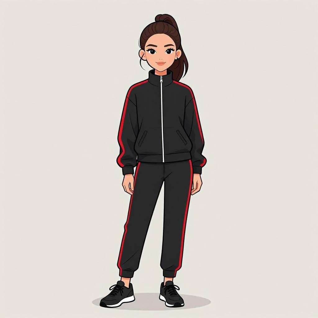 Woman with pretty face and pretty hair. smiling Woman, sporty casual, black tracksuit with a zip-up jacket, red piping trim, stand-up collar, matching sweatpants with red side stripes, cuffed ankles, black sneakers, high ponytail, neutral makeup, plain light-colored studio background. --sref 1467