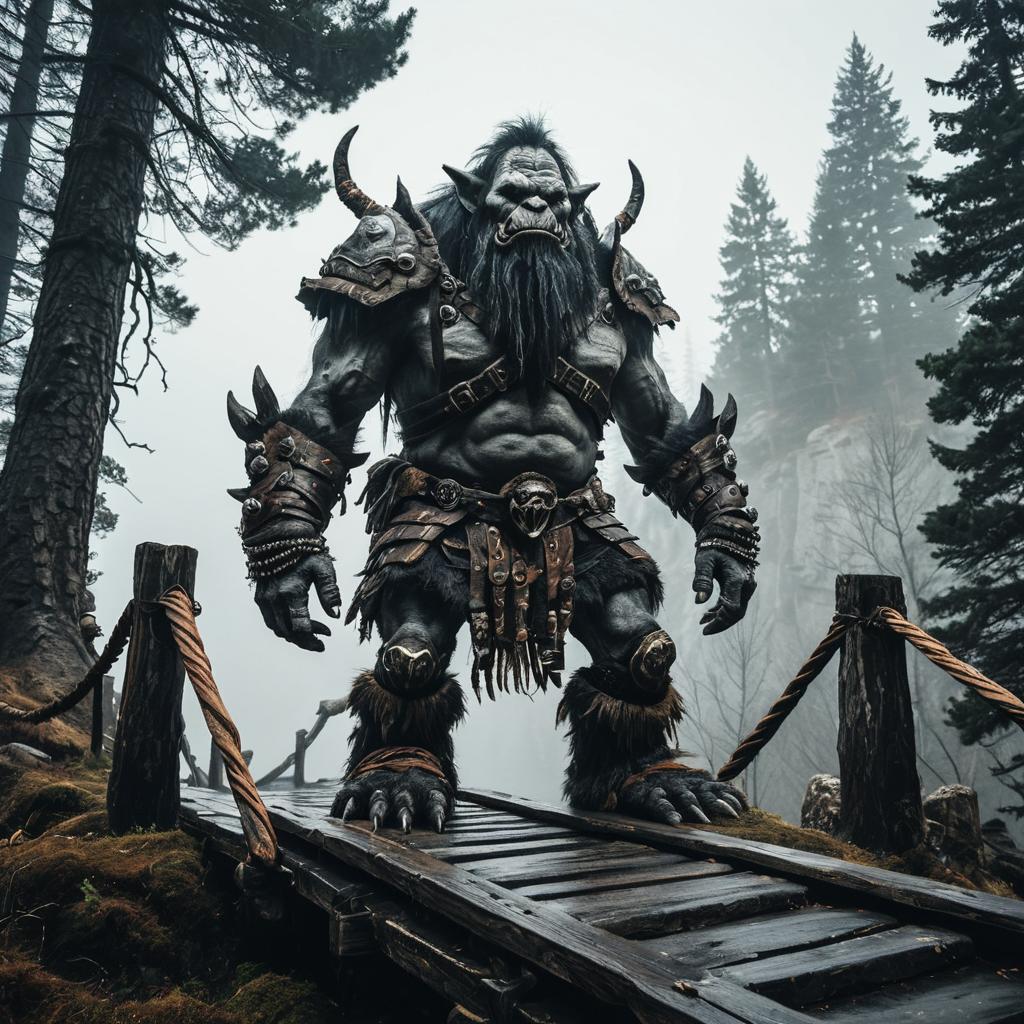A mountain troll guarding an ancient bridge, huge troll age 200 wearing crude armor made of leather and bones, surrounded by fog and twisted pine trees, style: mythic realism, realistic, 8k, intricate details