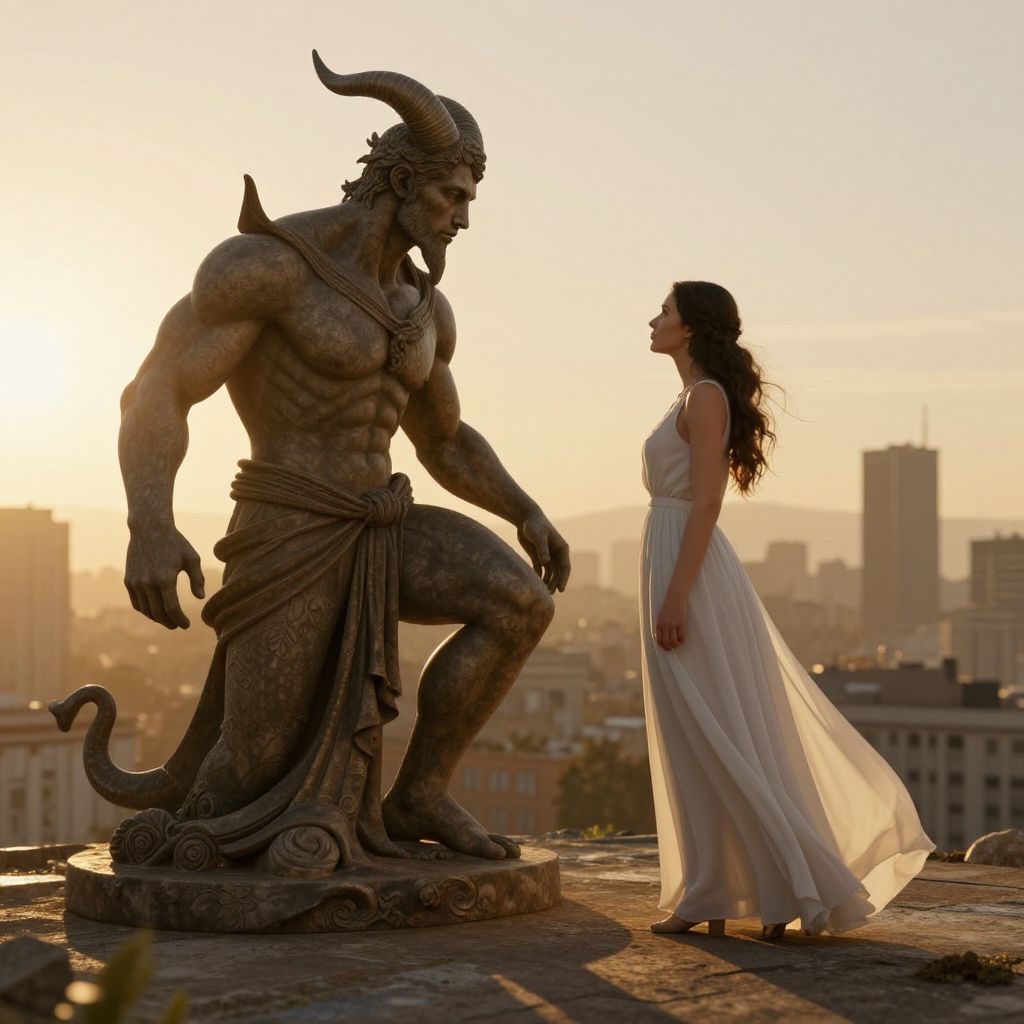 A computer-generated 3D render captures a surreal scene where a muscular, horned statue comes alive at dawn, engaging in a contemplative dialogue with a woman in a flowing white dress, as golden-hour sunlight bathes the cityscape in warm, dramatic lighting, evoking forgotten myths through the interplay of shadows and light.