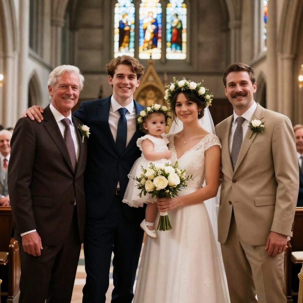 Photograph of a wedding party. Five people, three men, two women. Bride in white dress, bouquet, flower crown. Groom in blue shirt, beige jacket, mustache. Best man in brown suit, patterned tie. Groomsmen in dark clothes. Bride holding baby girl in white dress, flower crown. Background: cathedral, stained glass window, smiling guests. All smiling. Arms around each other. Indoor lighting.