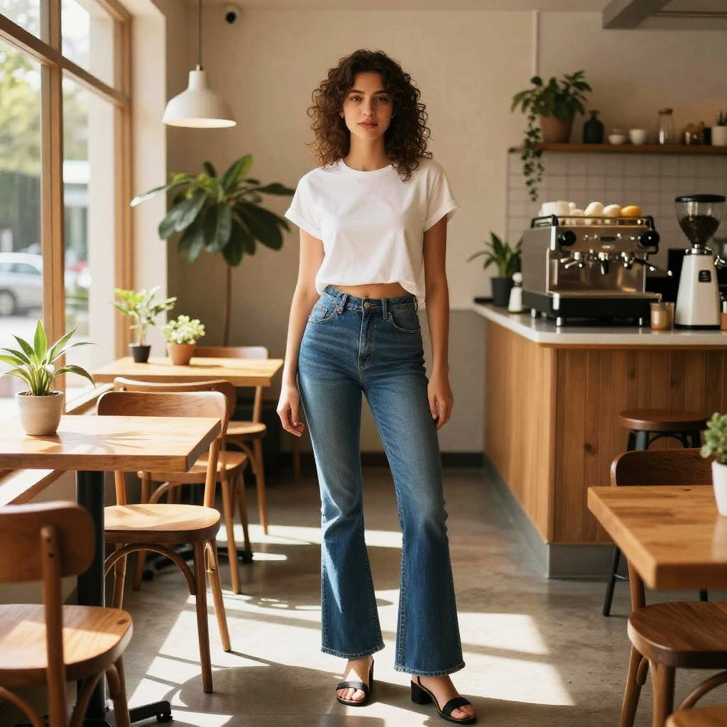 Photograph of a young woman with long brown hair, wearing a white "Fancy Vagabond" tee and high-waisted blue jeans