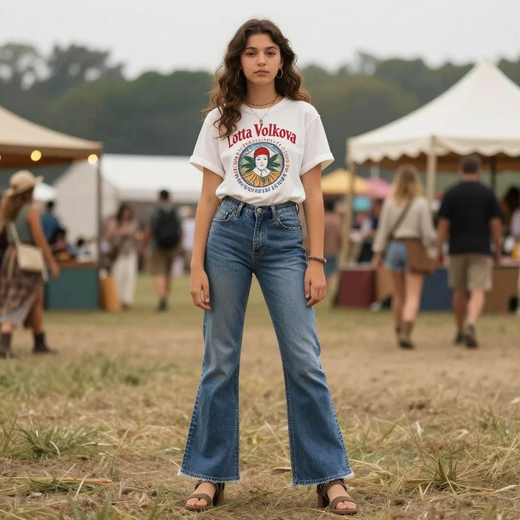 Realistic photo.A teen girl wearing flared jeans with a graphic tee styled by Lotta Volkova, standing confidently in a bohemian festival ambiance, evoking carefree spirit. realistic photo