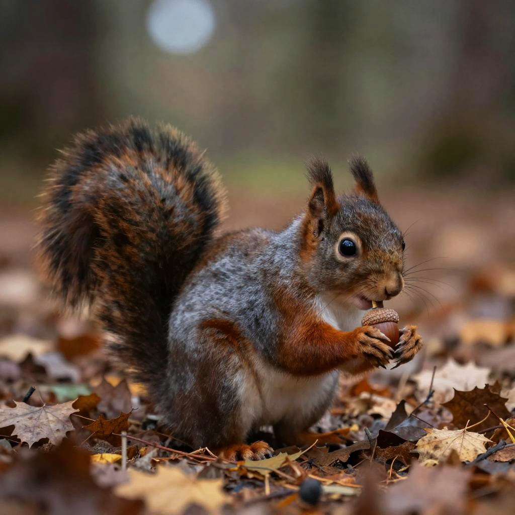 Highly detailed illustration of a small squirrel nibbling on an acorn, in a dense forest floor layered with autumn leaves, with cool morning light filtering through branches, soft textures, serene mood, intricate fur patterns, HD quality, gentle shadows, creating an inviting atmosphere for relaxation