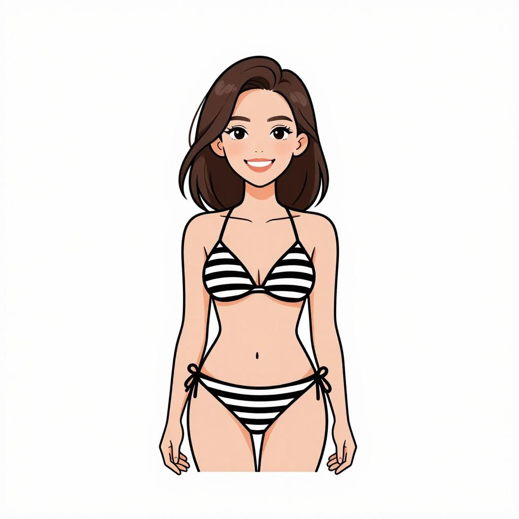 Woman with pretty face and pretty hair. smiling Woman, casual beachwear, striped two-piece bikini in monochrome palette, scoop neck, thin shoulder straps, matching low-rise bikini bottoms, white with horizontal black stripes, simple design, studio background with white backdrop --sref 1467