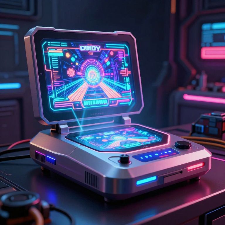 A futuristic reinterpretation of the Dendy console, sleek metallic design with neon accents, vibrant holographic game projections in a dark, cyberpunk environment, intense colors, high-tech atmosphere.