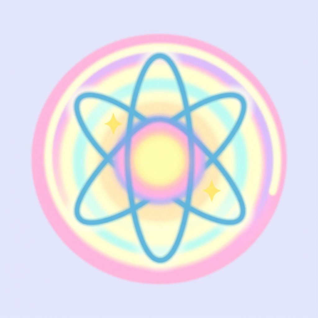 Digital abstract artwork of a glowing, neon blue atomic symbol with six petals, surrounded by a pink and yellow halo.