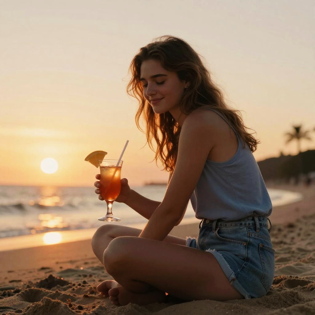 Photograph of a young woman with long, wavy brown hair sitting on a sandy beach at sunset. She wears a light blue tank top and denim shorts, holding a glass of iced tea with a straw and lemon slice in her right hand. Her skin is tanned, and she is smiling softly. The sun is low in the sky, casting a golden glow over the scene, with the ocean and palm trees visible in the background. The sand is textured, and the overall atmosphere is relaxed and serene.