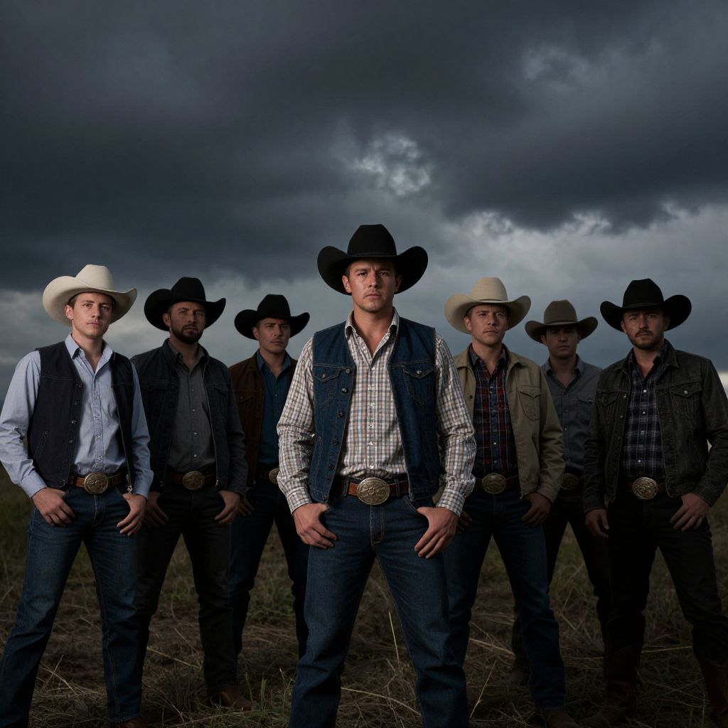 A group of men in cowboy hats stand in a dark, cloud-filled sky, creating a dramatic and cinematic atmosphere.