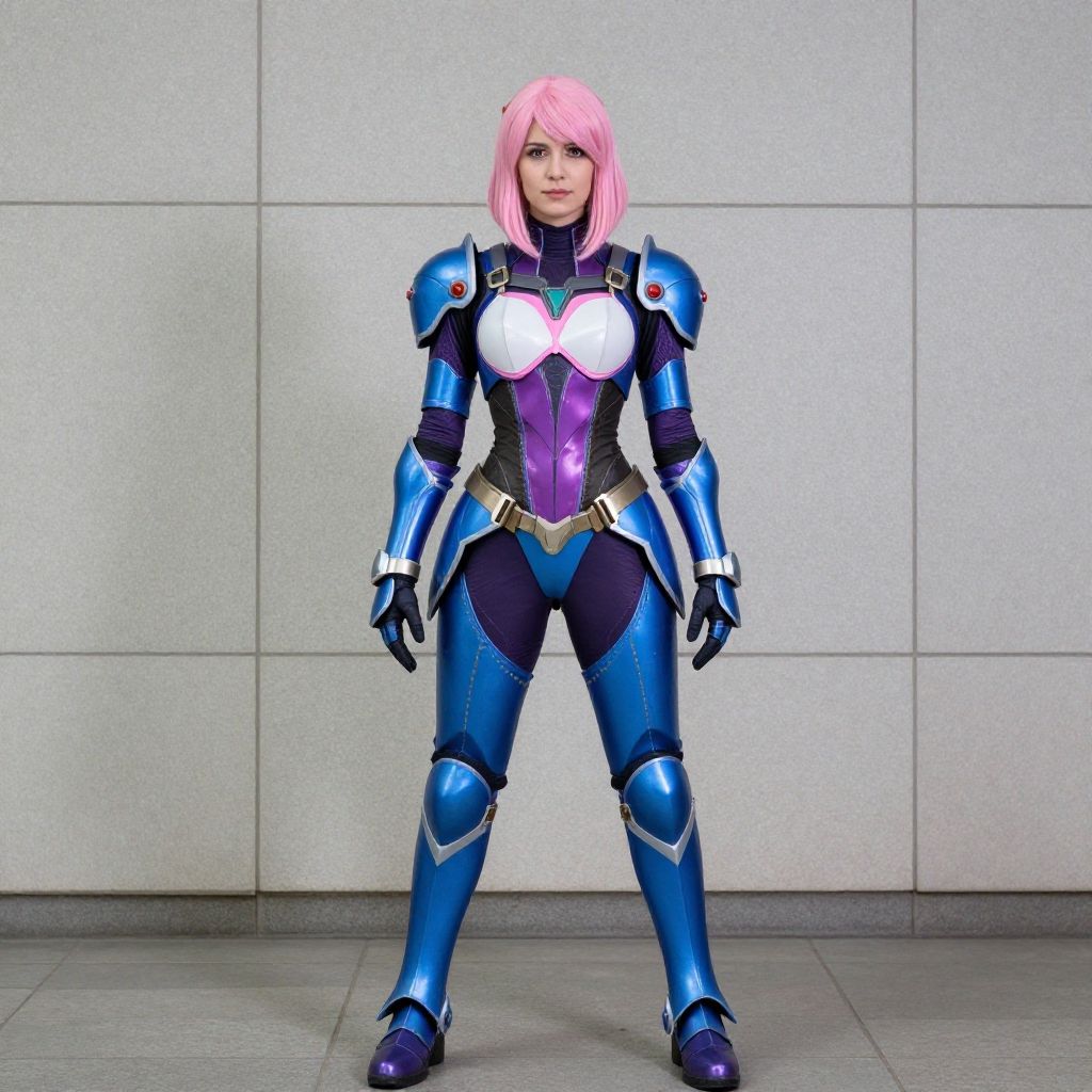 A woman dressed in a vibrant, futuristic armor cosplay outfit stands confidently against a plain tiled wall. Her costume features metallic blue and purple armor pieces, accented with a pink and white chest plate, complemented by her striking pink bob hairstyle, showcasing a science fiction or fantasy-inspired style.