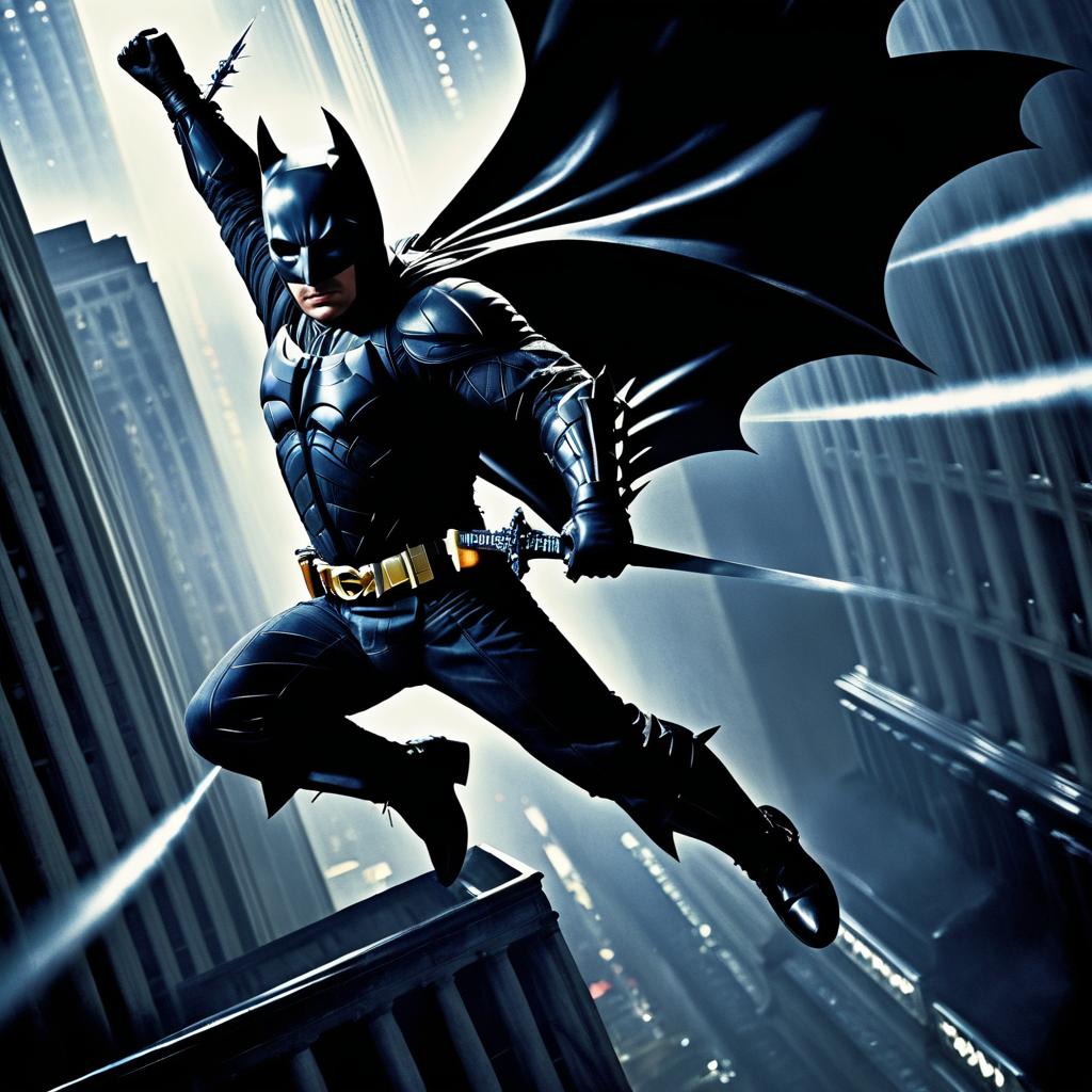 Movie poster of The Dark Knight with Christian Bale swinging a Batarang by Christopher Nolan with exquisite detail.