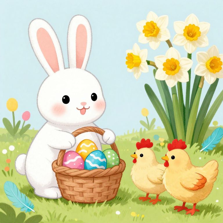 Felt cute easter bunny followed by chickens, feathers in many colors, basket full of colorful eggs, many daffodils, comic style,