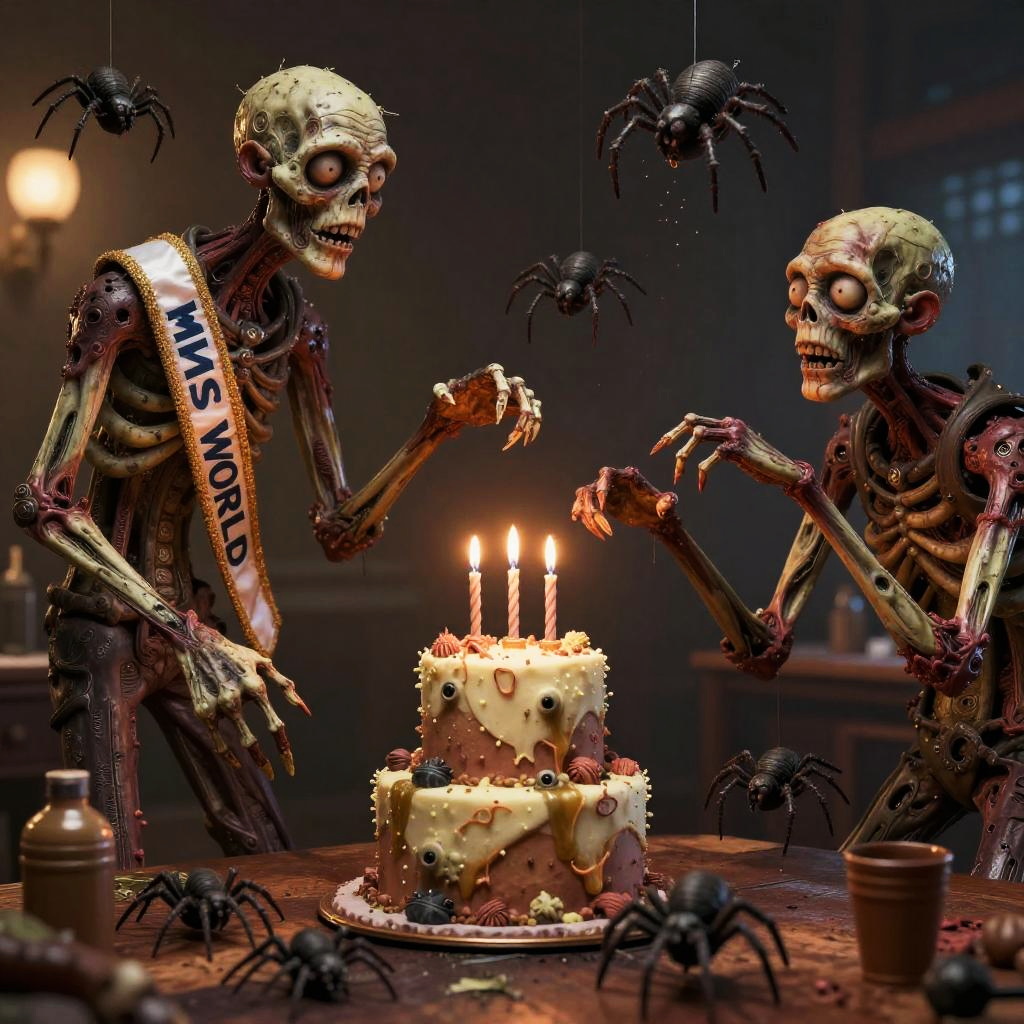 A sculpture made of moldy zombies bodies on a birthday party having fun with spiders larvas and miss world photorealistic, 8k, scifi, grimdark, neuromancer, death