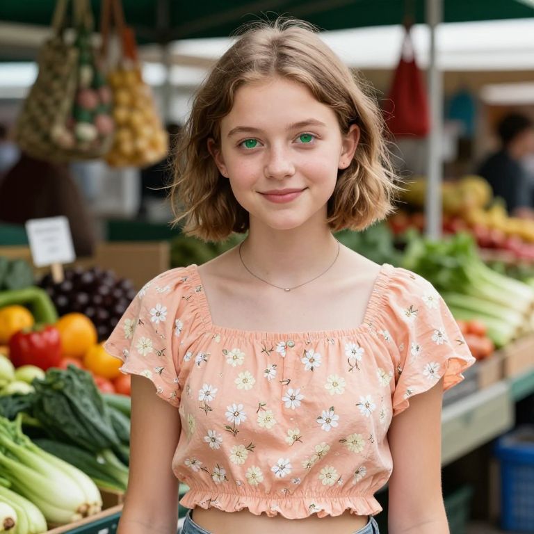 A cheerful adolescent girl with wide hazel eyes and short brown hair wears a floral gingham crop top in yellow and black checks. She’s standing in a lively summer market outside a vegetable stall, holding a bright red apple, surrounded by colorful produce and vendors, with morning sunlight filtering through the open stalls and creating warm shadows.