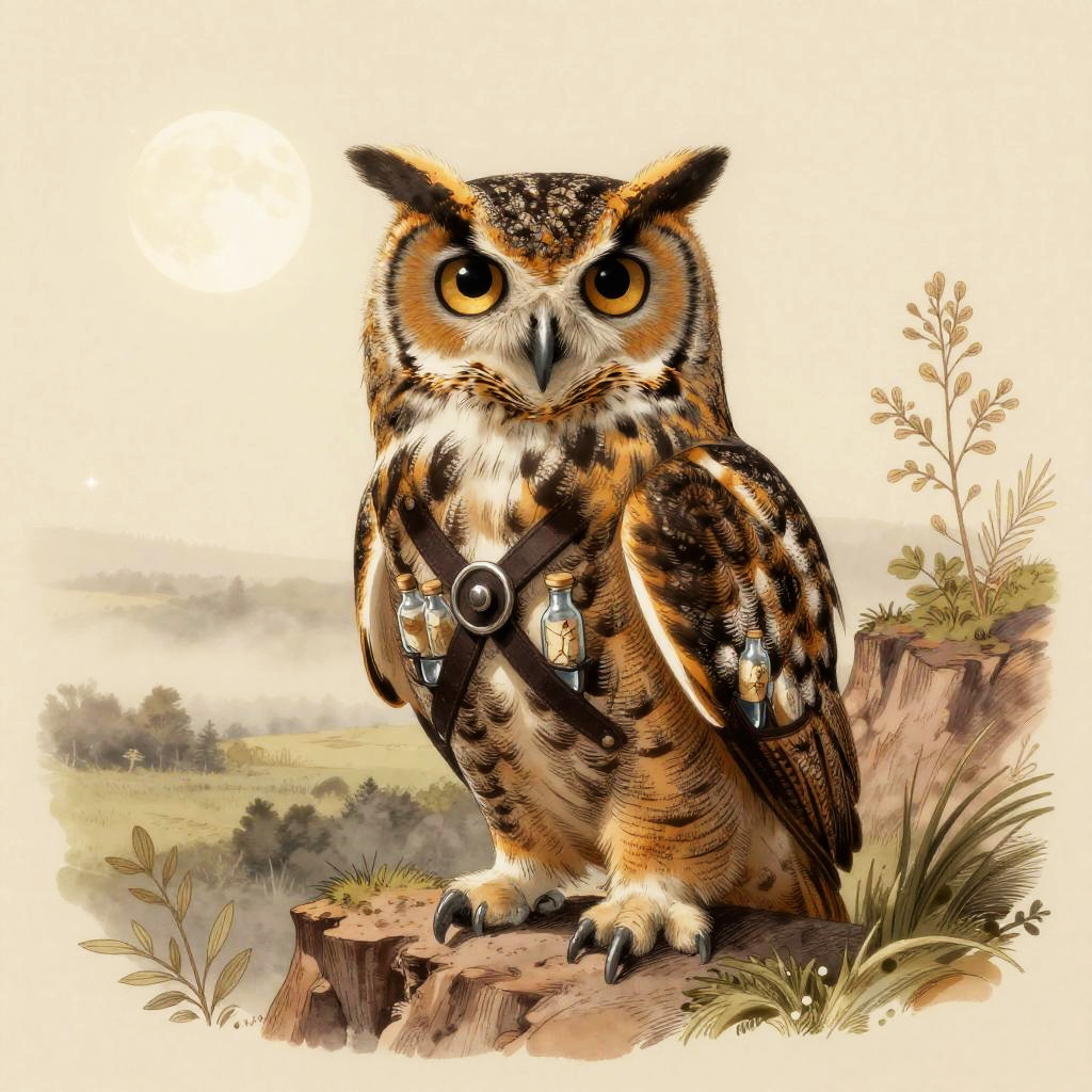 A majestic great horned owl wearing a dark leather harness fitted with small glass vials, set in a moonlit cliffside overlooking misty lowlands, vintage illustration aesthetic with delicate linework and fine crosshatching, muted warm palette on a soft cream backdrop, ornate botanical detailing, gentle and charming atmosphere, soft rim lighting, subtle paper grain texture, balanced and symmetrical composition, slight vignette, natural bokeh sparkle, ultra clean edges, high fidelity details
