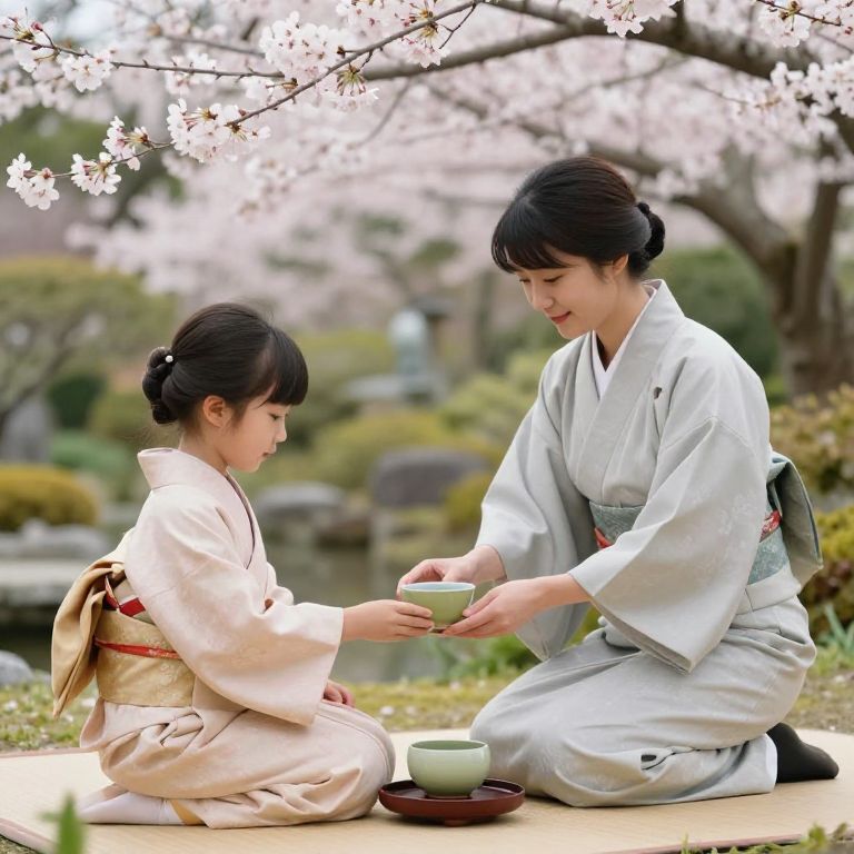 Photograph of a Japanese woman in a white kimono kneeling beside a young girl in a beige kimono, sharing a green tea on a mat under