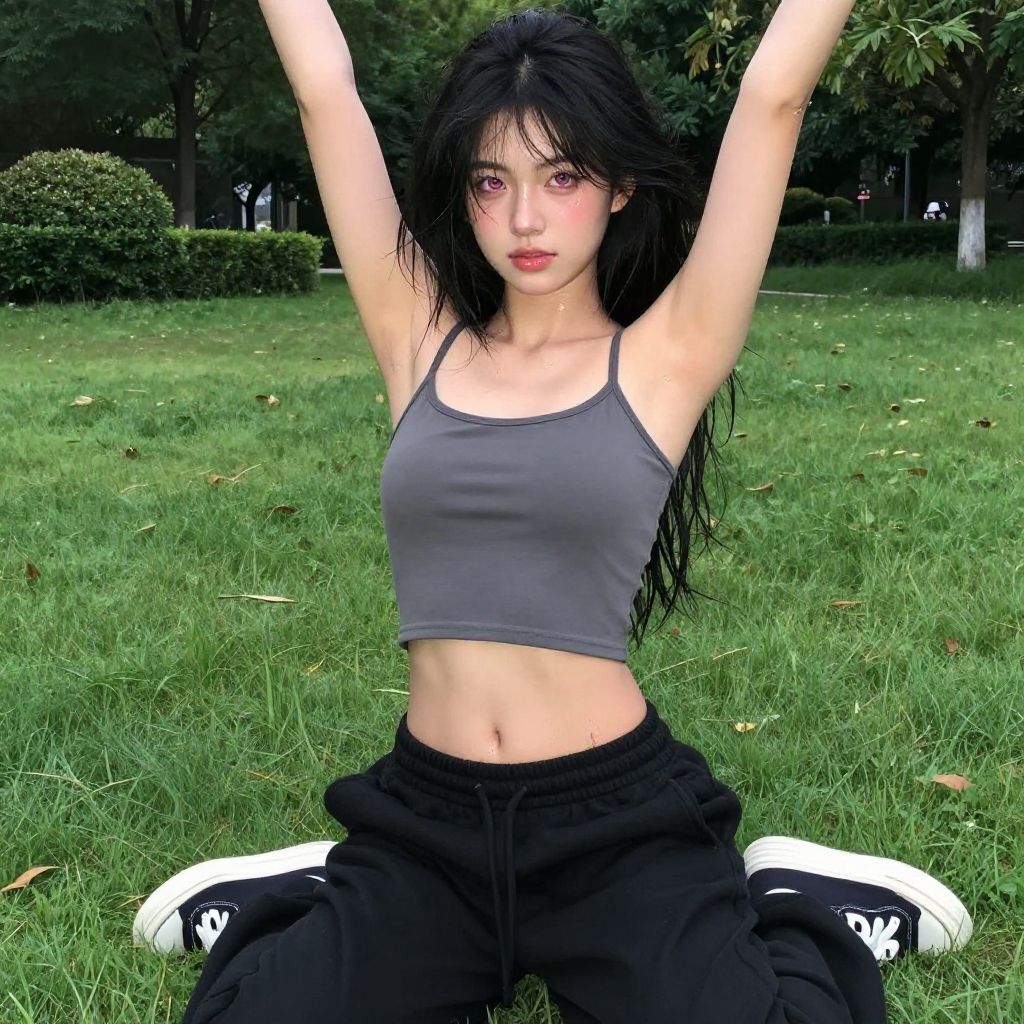 Best quality, masterpiece, 1girl, long hair, black hair, (messy hair), ahoge, pink eyes, arms up, camisole, medium breasts, (black sweatpants:1.2), full body, (armpit hair:1.3), sweat, outdoors, park, sneakers
