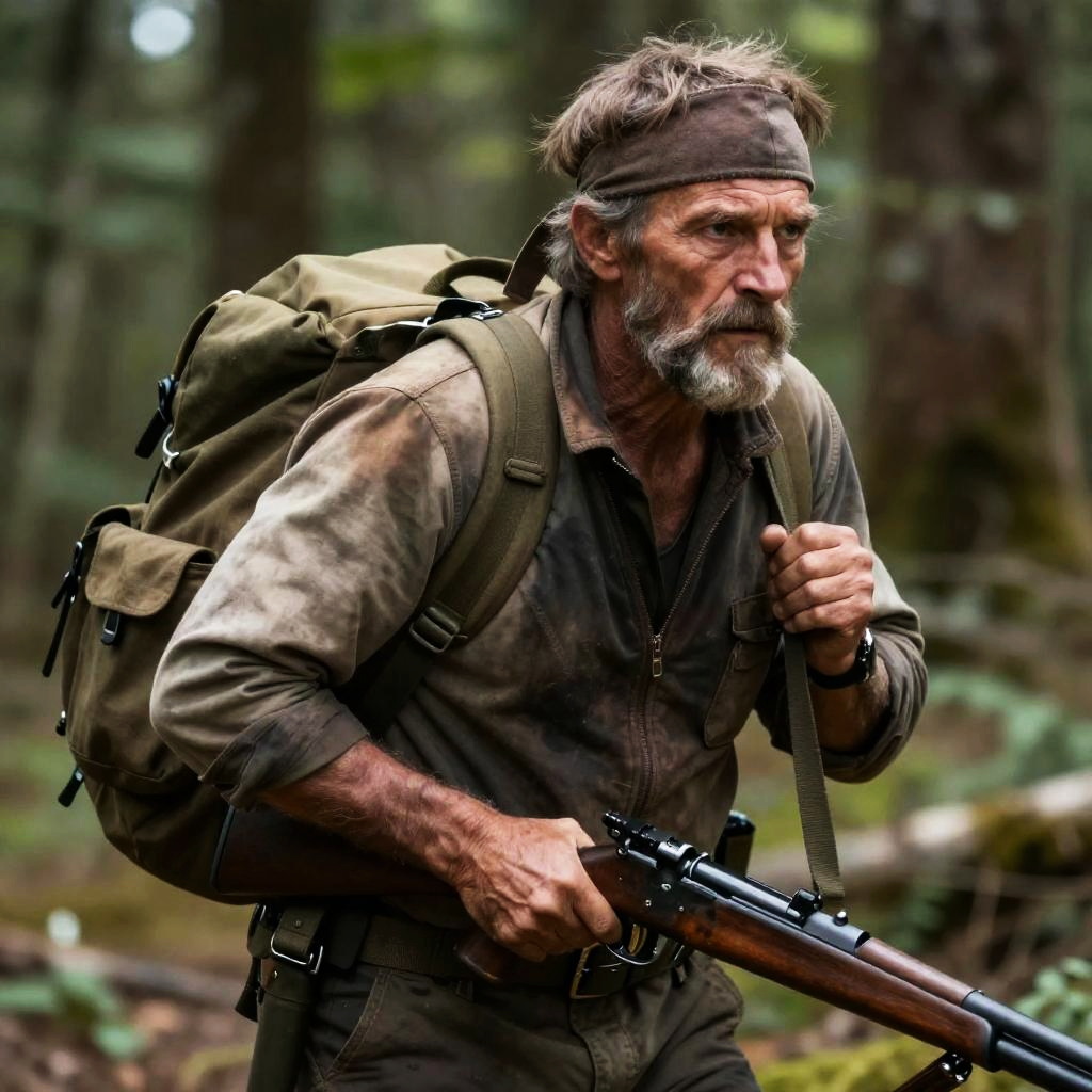 Photograph of a rugged, bearded man with tousled brown hair holding a rifle. American flag background with stars. Man's intense gaze directed forward. He wears a dark green shirt. Flag has worn ure. Man's right hand grips rifle's stock.