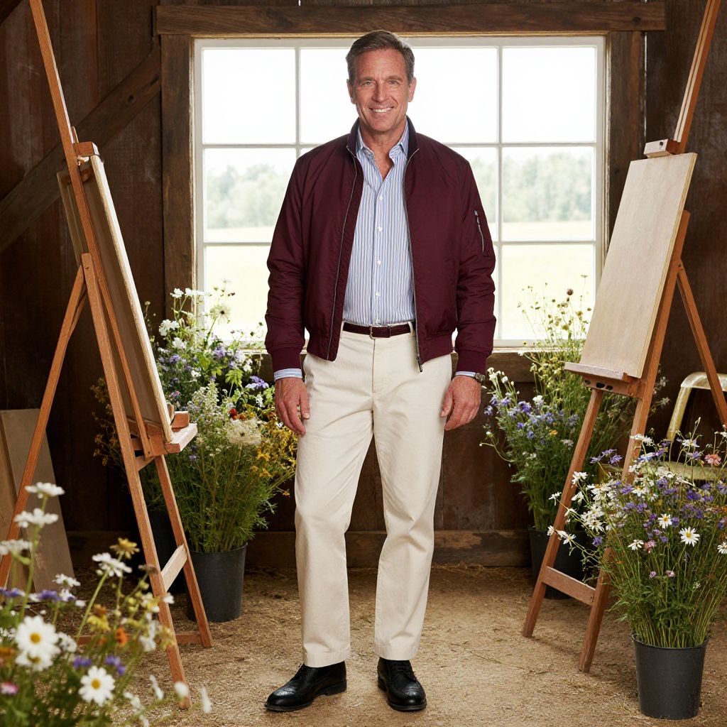 "a man, burgundy bomber jacket, striped button-up shirt, cream chinos, black brogues, rustic barn, large windows, easels surrounded by wildflowers, cinecolor, relaxed smile, confident demeanor. Man has masculine face and piercing eyes"