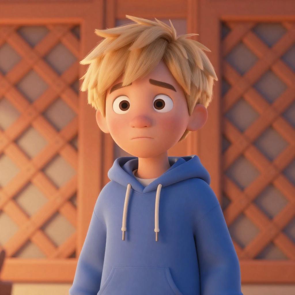 Animated boy with short, spiky blonde hair, wearing a ured blue hoodie, standing in front of an orange, lattice-patterned background. Background features warm, glowing lights and intricate patterns. Boy's expression is slightly concerned.