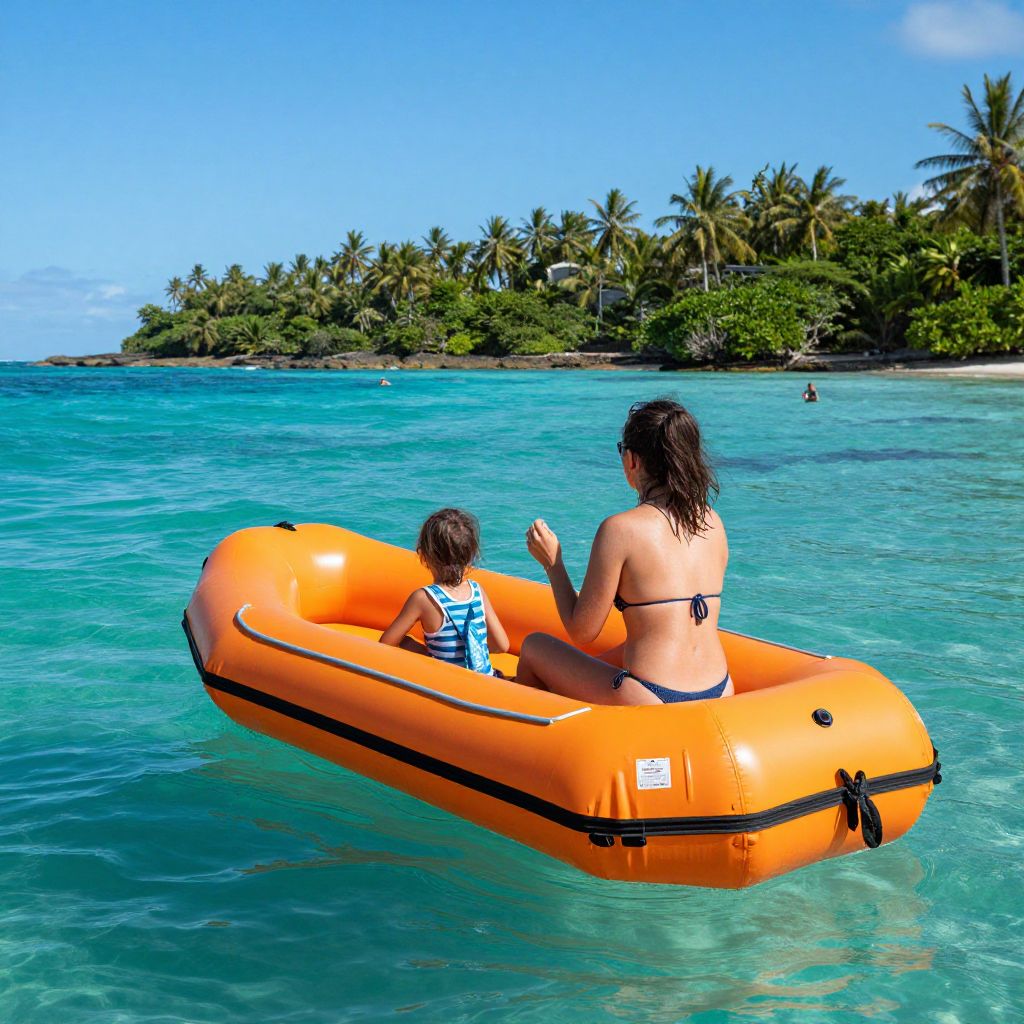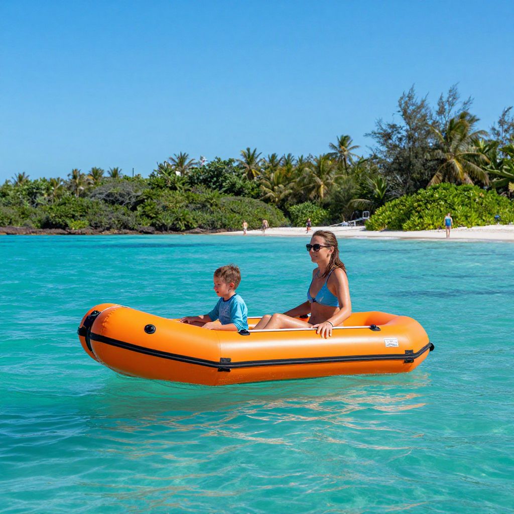 Photograph of a sunny, tropical scene featuring a woman and young boy in an orange inflatable raft floating on crystal-clear, turquoise water. The woman, wearing a blue bikini and sunglasses, sits at the rear, while the boy, in a blue shirt, sits in front. The background includes a white sandy beach, lush green palm trees, and clear blue sky. The water is calm, and the raft has black trim and a small logo on the side. The overall mood is relaxed and leisurely.