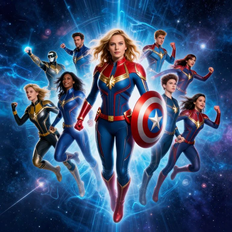 Photograph-style digital artwork of a diverse group of seven superheroes in vibrant, detailed costumes, set against a cosmic backdrop. Central figure is a blonde woman in a red, blue, and yellow Captain Marvel suit, holding a red and white shield. Surrounding her are six other heroes, including a masked man in blue and black, a woman with long black hair in a similar suit, and others in red and blue suits with star emblems. Bright blue light emanates from behind them, enhancing their dynamic, action-ready poses. The background features a starry, space-like pattern.