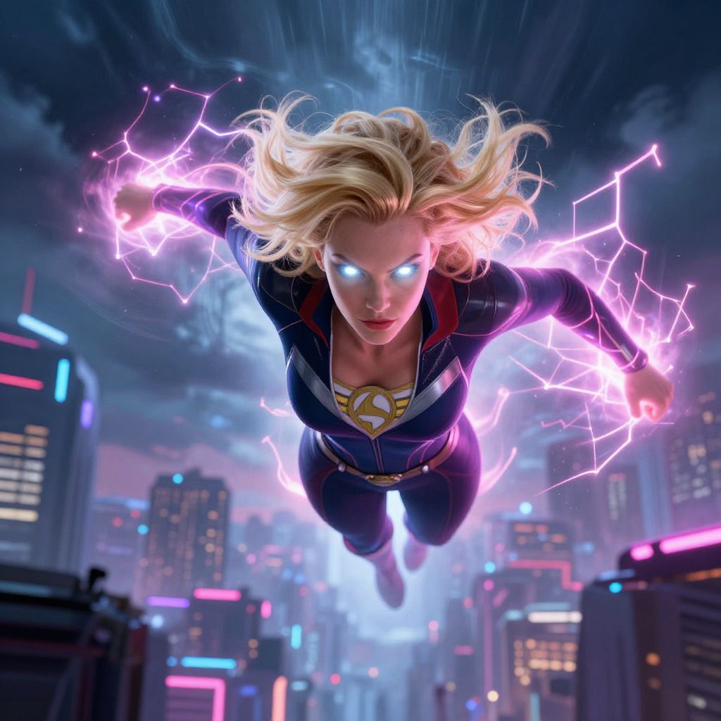 An electrifying assembly of cosmic heroes defies gravity and reality, soaring through a radiant blue void with Captain Marvel's shield as the centerpiece, embodying the limitless possibilities of the Marvel universe.