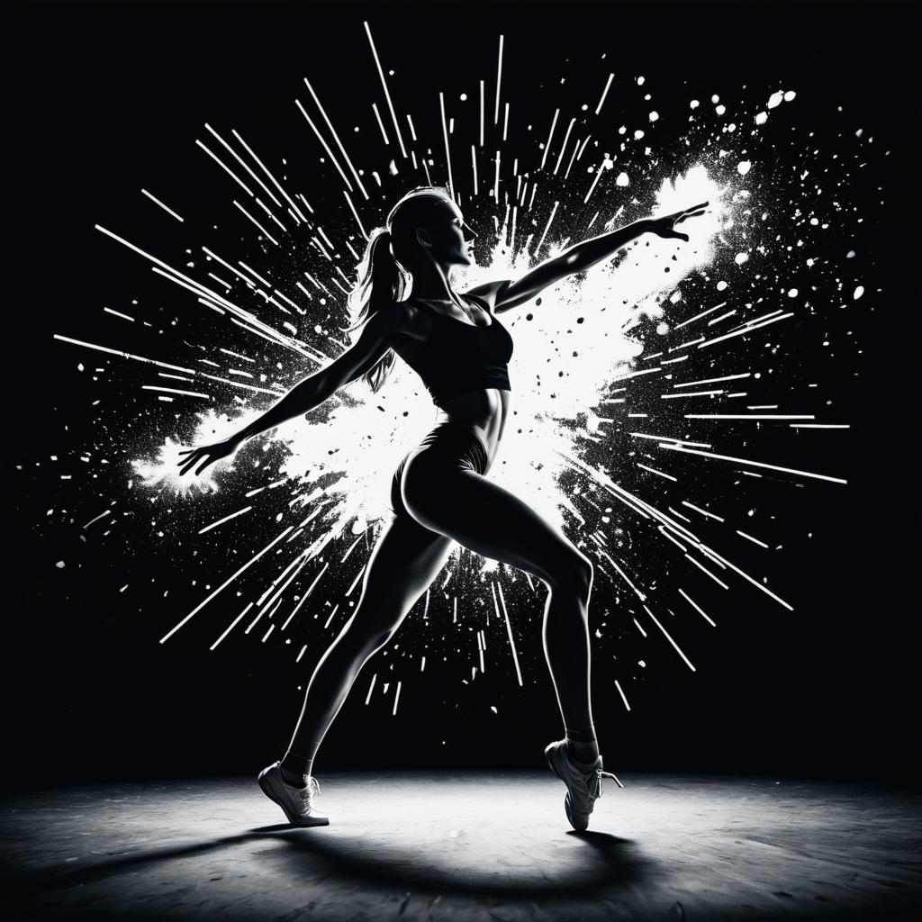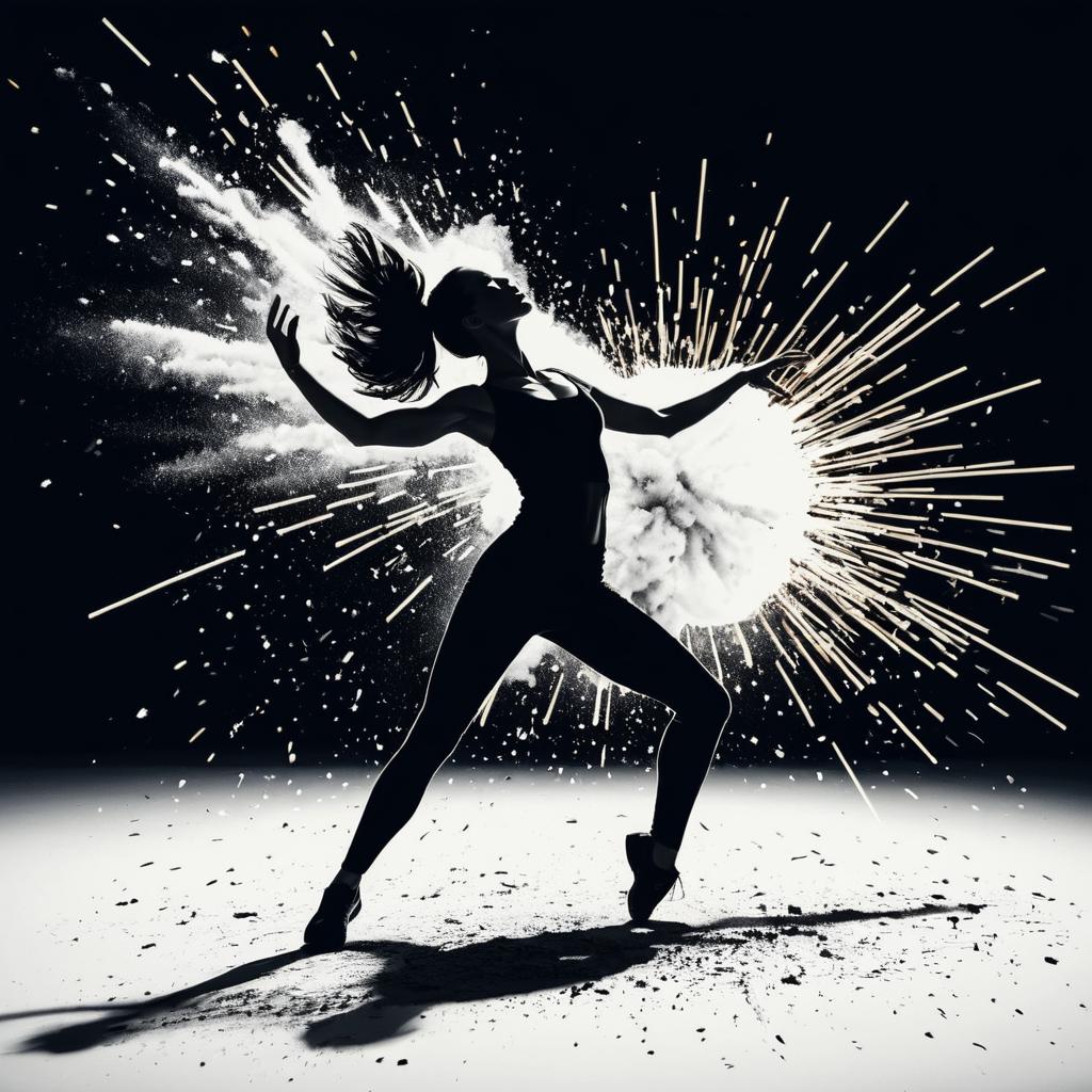 High contrast 2D illustration of a female contemporary solo dancer in motion, depicted with strong outlines and bold traces. The dancer is captured in a dynamic pose wearing a sports bra, leggings, and sneakers. Behind her, a striking white powder explosion effect contrasts sharply against the black background, emphasizing energy and movement.