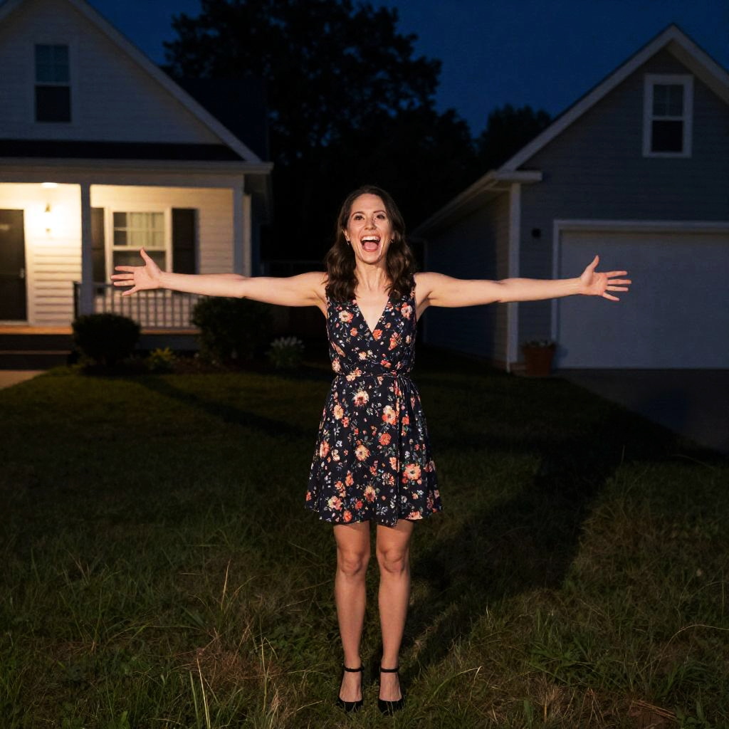 Photograph of a woman at night, standing on a grassy front yard. She has medium-length brown hair, wears a floral sleeveless dress and black heels. Her arms are outstretched, and she has a wide, intense smile. Two houses are in the background, one with white siding and the other with gray siding. The house with white siding has a lit porch and steps.