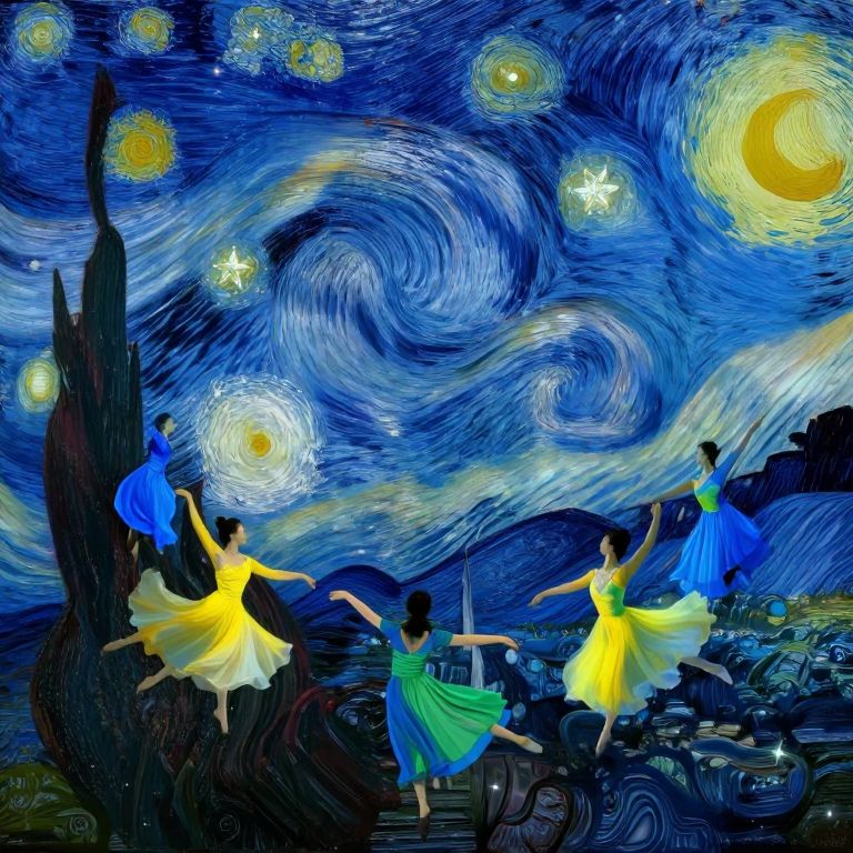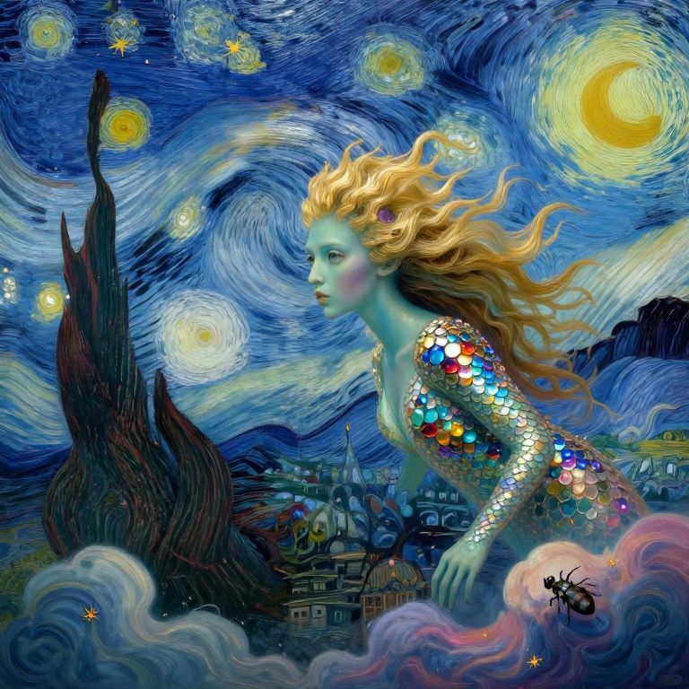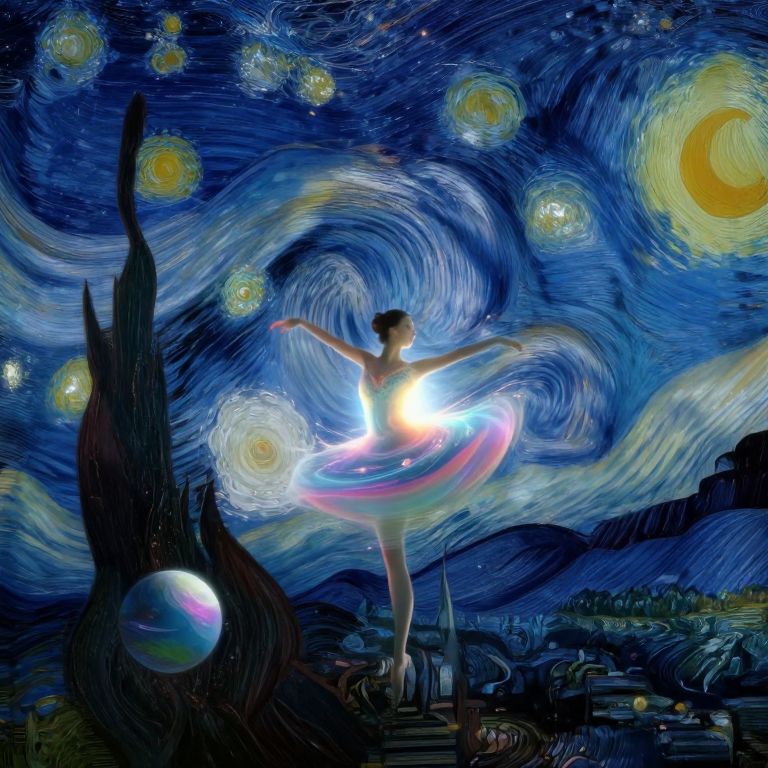Envision an intricate digital artwork showcasing a celestial fairy with glistening wings dancing gracefully in a dreamlike cosmic landscape, evoking the whimsical spirit of Van Gogh's Starry Night. From an unconventional aerial viewpoint, her ethereal form pirouettes amidst swirling galaxies and nebulae, painted with vibrant brushstrokes that meld into an abstract tapestry of colors and forms. Adorned in avant-garde attire composed of shimmering stardust and celestial bodies, the fairy's enigmatic beauty is accentuated as she glides through the mesmerizing scene, bathed in the soft light of distant stars and nebulae colliding in a harmonious chaos.