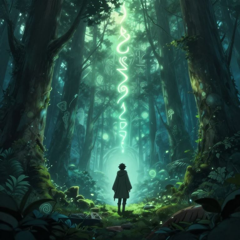 Anime.filter mystical forest scene with a lone adventurer in a cloak, glowing magical runes floating in the air, soft light filtering through dense foliage, intricate background details, ethereal atmosphere, digital painting style