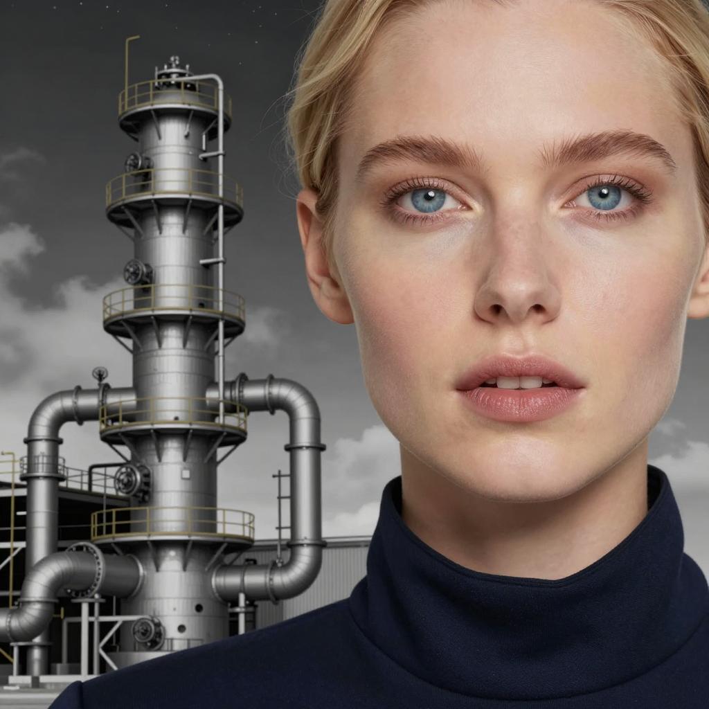 Close-up of a blonde woman with blue eyes and parted lips, wearing a dark blue collar. Left side has a detailed, grayscale illustration of a large, complex industrial structure with multiple rings and pipes. Background is a night sky with stars and clouds. Woman's face occupies the right half, industrial structure the left half.