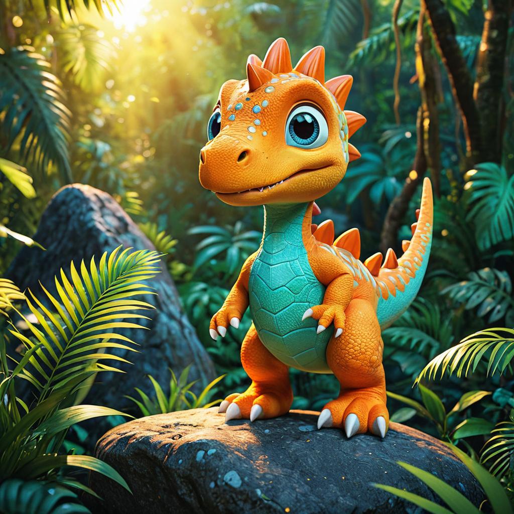 A vibrant 3D stylized cartoon baby dinosaur standing on a rock in a lush jungle setting during golden hour. The dinosaur features large expressive blue eyes, smooth scales, bright turquoise and orange coloring, and detailed claws. Sunlight softly illuminates the scene, highlighting the warm orange and green hues of the jungle foliage.