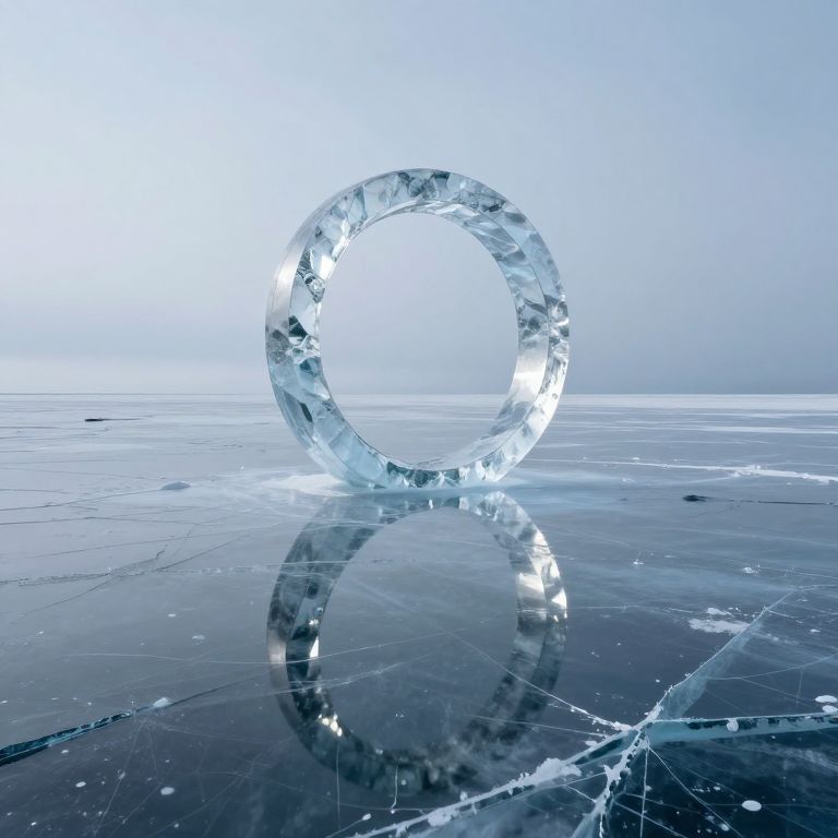 Amidst a desolate expanse of fractured ice and mirrored reflections, a crystalline ring stands as a portal to eternity, inviting contemplation of the boundless cycles of existence and the quiet solitude of infinite horizons.
