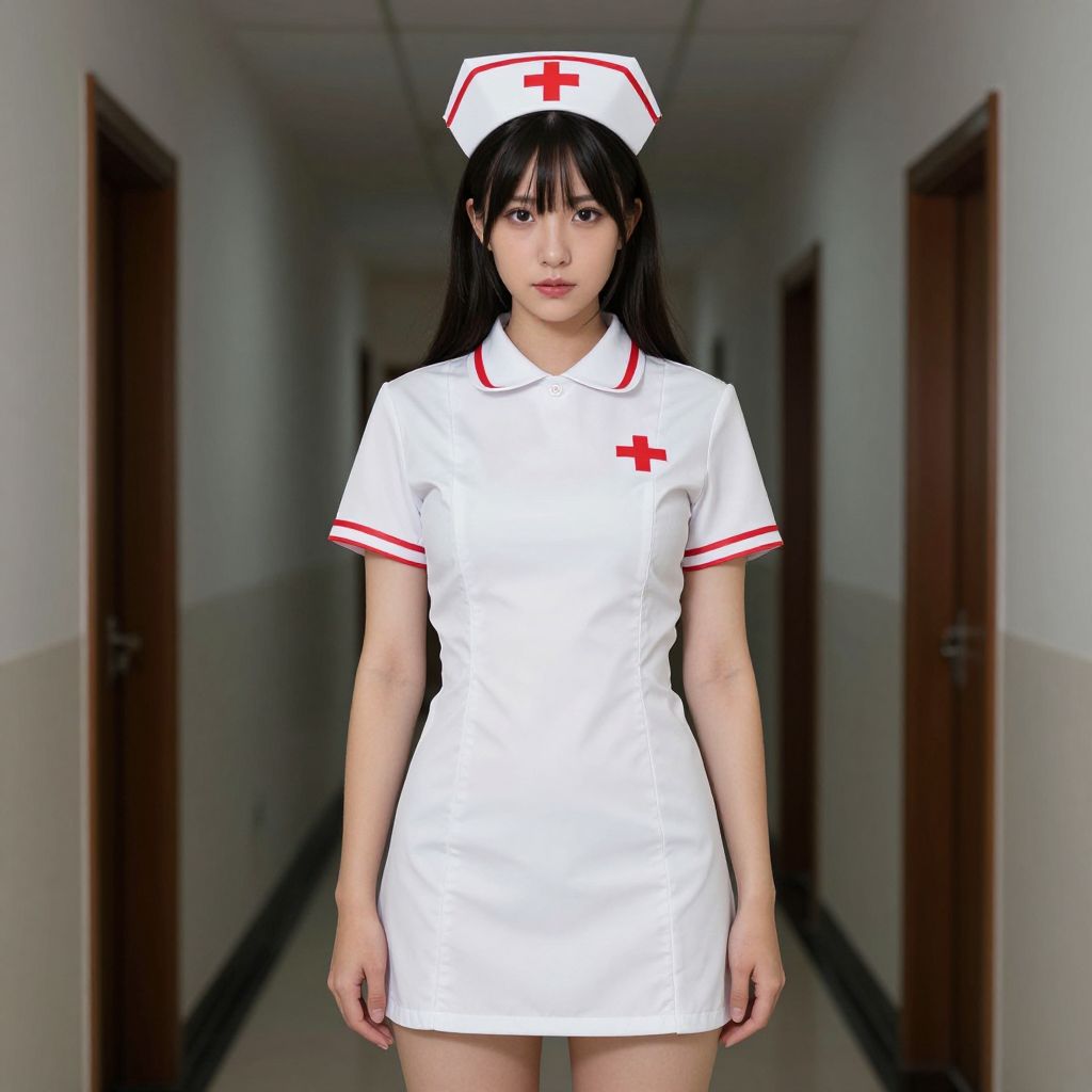 Photograph of an East Asian woman with long black hair and bangs, standing in a dimly lit, narrow hallway with white walls and wooden doors. She wears a white nurse uniform with red trim and a red cross on the hat, dress, and chest. The short dress is form-fitting, highlighting her slender build. Her expression is neutral, and she stands centered, facing the camera. The hallway has a slightly worn, institutional feel. The image has a slightly surreal, digitally enhanced quality, giving it a slightly over-exposed look.
