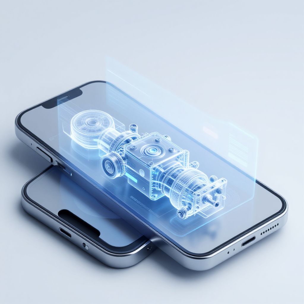 Future tech holograms inside a sleek, transparent smartphone showing detailed 3D models of machinery