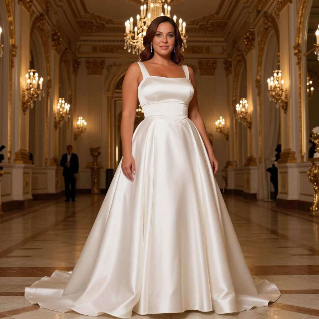 Photograph of a curvy woman with medium brown skin and shoulder-length, wavy dark brown hair, wearing a white, sleeveless satin wedding gown with a fitted bodice and full skirt. She stands confidently in an opulent, gold-accented ballroom with marble floors and large, ornate chandeliers. The background includes dimly lit sconces and blurred figures, adding a luxurious ambiance. The gown's smooth texture contrasts with the room's intricate decor, highlighting her elegant presence. The woman's makeup is subtle, with a natural look.