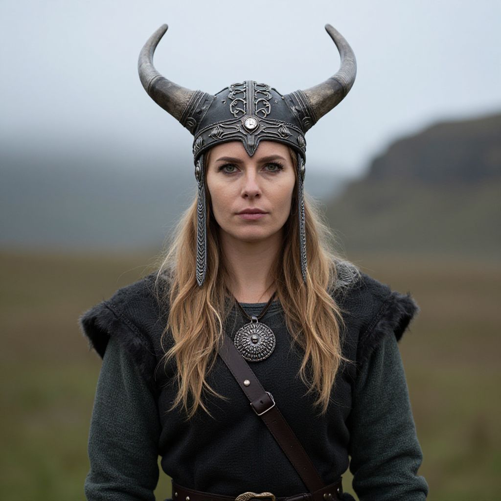 Photograph of a Caucasian woman with long, wavy blonde hair wearing a silver Viking helmet with large, curved horns and intricate detailing. She has fair skin and blue eyes, and is dressed in a dark, woolen tunic with a brown leather strap across her chest. The background is a misty, overcast landscape with blurred, green hills. The woman's expression is serious, and the image has a slightly fantasy or historical reenactment style. The lighting is natural, with soft, diffused light.