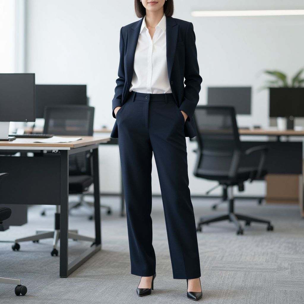 "Work Pants Woman Office, woman in a business outfit standing in an office with her hands in her pockets"