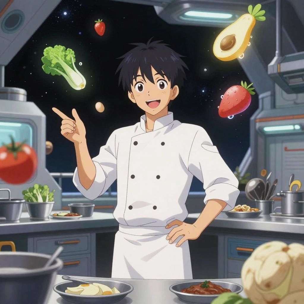 A space station chef, with bright, welcoming smile, surrounded by floating glowing ingredients, in a bustling zero-gravity kitchen, depicted in the genre-blending and ethereal style of Yoko Kanno.