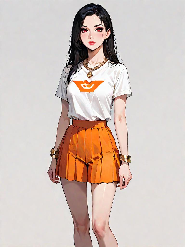 Digital illustration of a confident young woman walking alone on a shiny tiled street, wearing a fitted navy blue and white pinstriped dress with a bold yellow 'Q' logo on the front. She has short black hair, black sunglasses, black socks, and black shoes. Shadowy figures and two guards in black uniforms flank her on either side, emphasizing her prominence and focus.