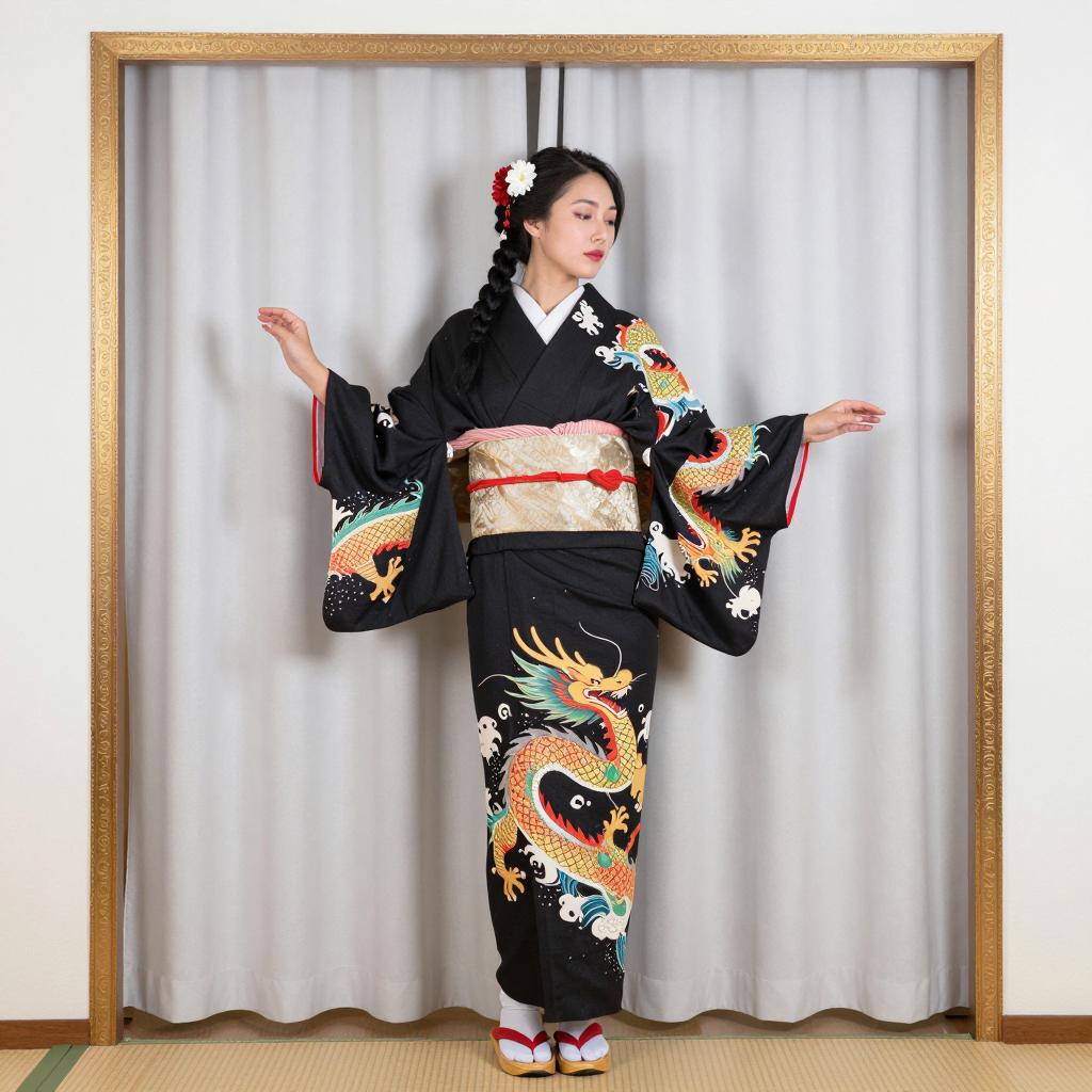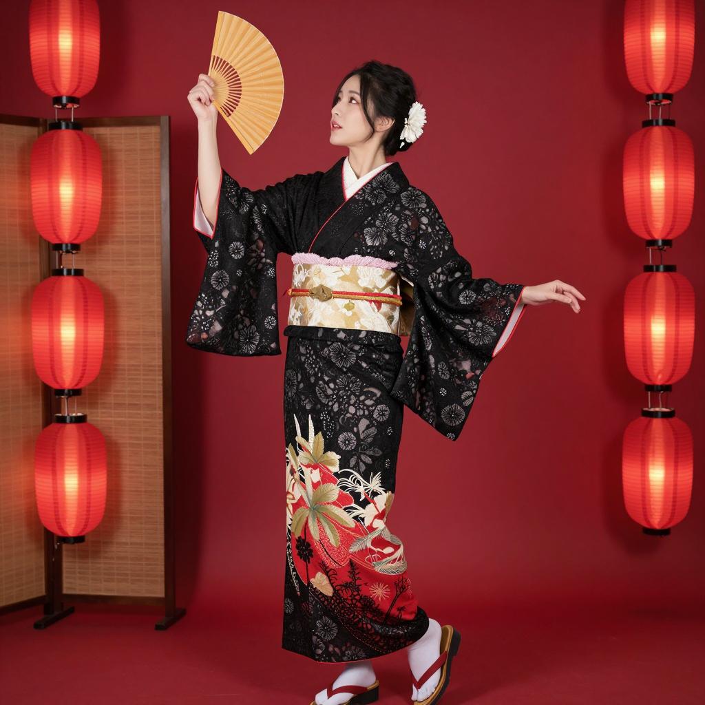 Japanese woman in elaborate kimono with black, red, and floral patterns. Large red bow on head, red eyes. Standing with arms out, surrounded by red and purple paper umbrellas. Background includes red paper lanterns and shoji screen. Marble floor. Floral hairpins and accessories. Floral leggings. Traditional Japanese setting.