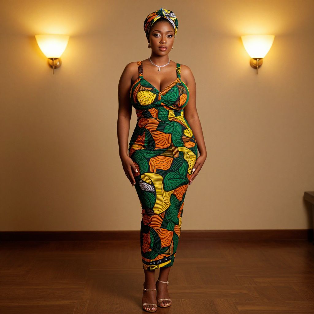 Photograph of a confident, dark-skinned African woman standing in a warmly lit room. She wears a form-fitting, sleeveless dress with a vibrant, colorful abstract pattern in green, yellow, orange, and white. Her hair is styled in a matching patterned headwrap. She accessorizes with a pearl necklace and silver high-heeled sandals. The background features beige walls with two wall-mounted sconces casting a soft yellow glow. The wooden floor adds a warm, earthy tone to the scene. The woman's poised stance and direct gaze exude elegance and confidence.