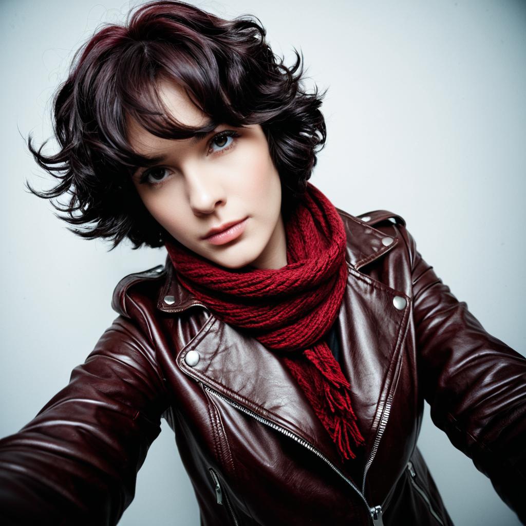 Portrait of a young woman with short wavy black hair wearing a fitted brown leather jacket and a deep red knitted scarf against a plain grey background. The image is taken with studio lighting emphasizing her facial features and the texture of her clothing.